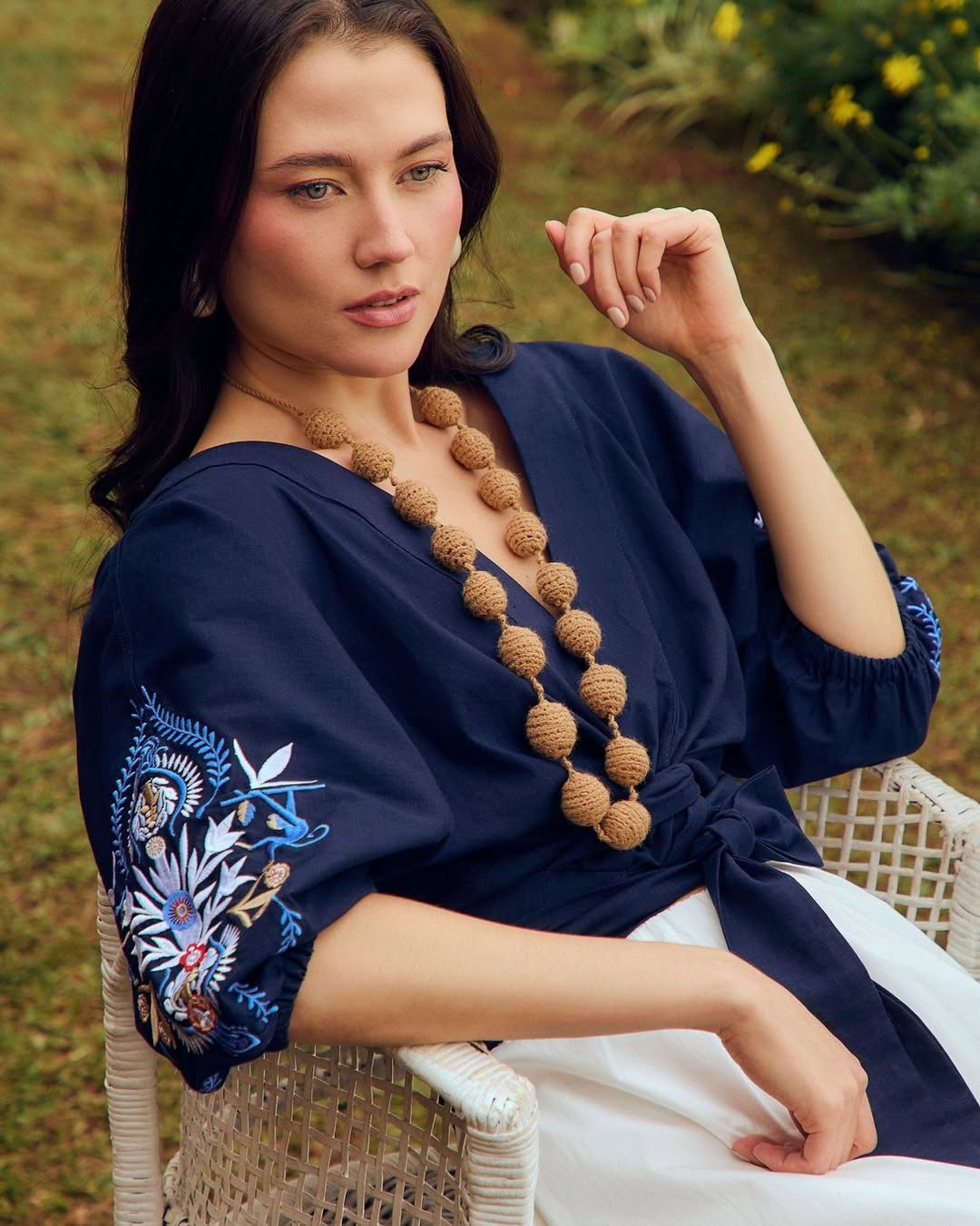 La blusa Antonella presenta un diseño cruzado al frente con escote en V y mangas tres cuartos terminadas en puño elástico. Los bordados en las mangas muestran motivos botánicos de inspiración artesanal en tonos vivos que aportan textura y contraste visual. Su silueta equilibra líneas limpias con detalles elaborados que realzan su composición.