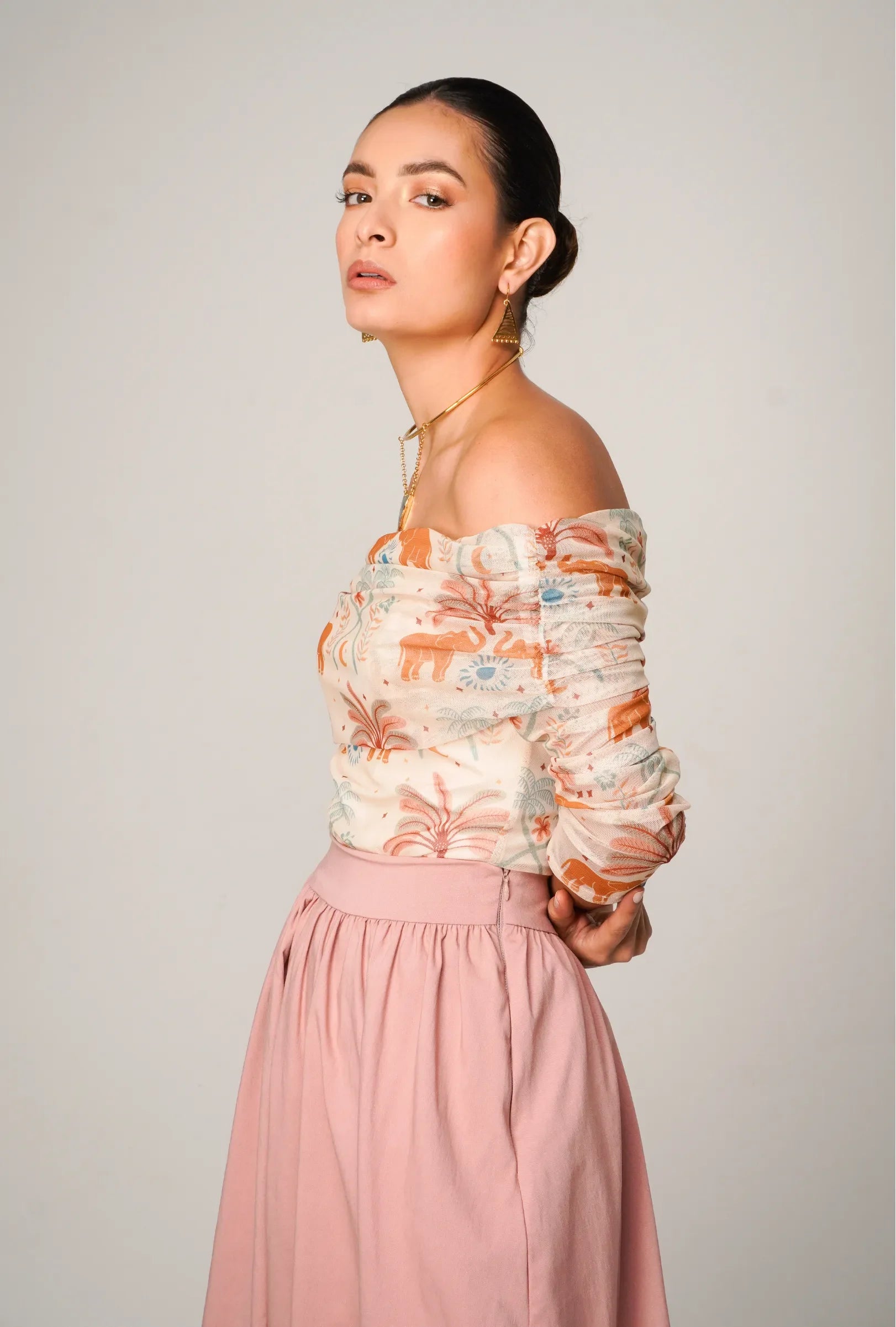 El body Positano es elegante con diseño off-shoulder que realza delicadamente los hombros y el escote. Confeccionado con un estampado floral sutil que evoca ligereza y romanticismo. Mangas largas que añaden un toque de sofisticación, ideal para cualquier ocasión.