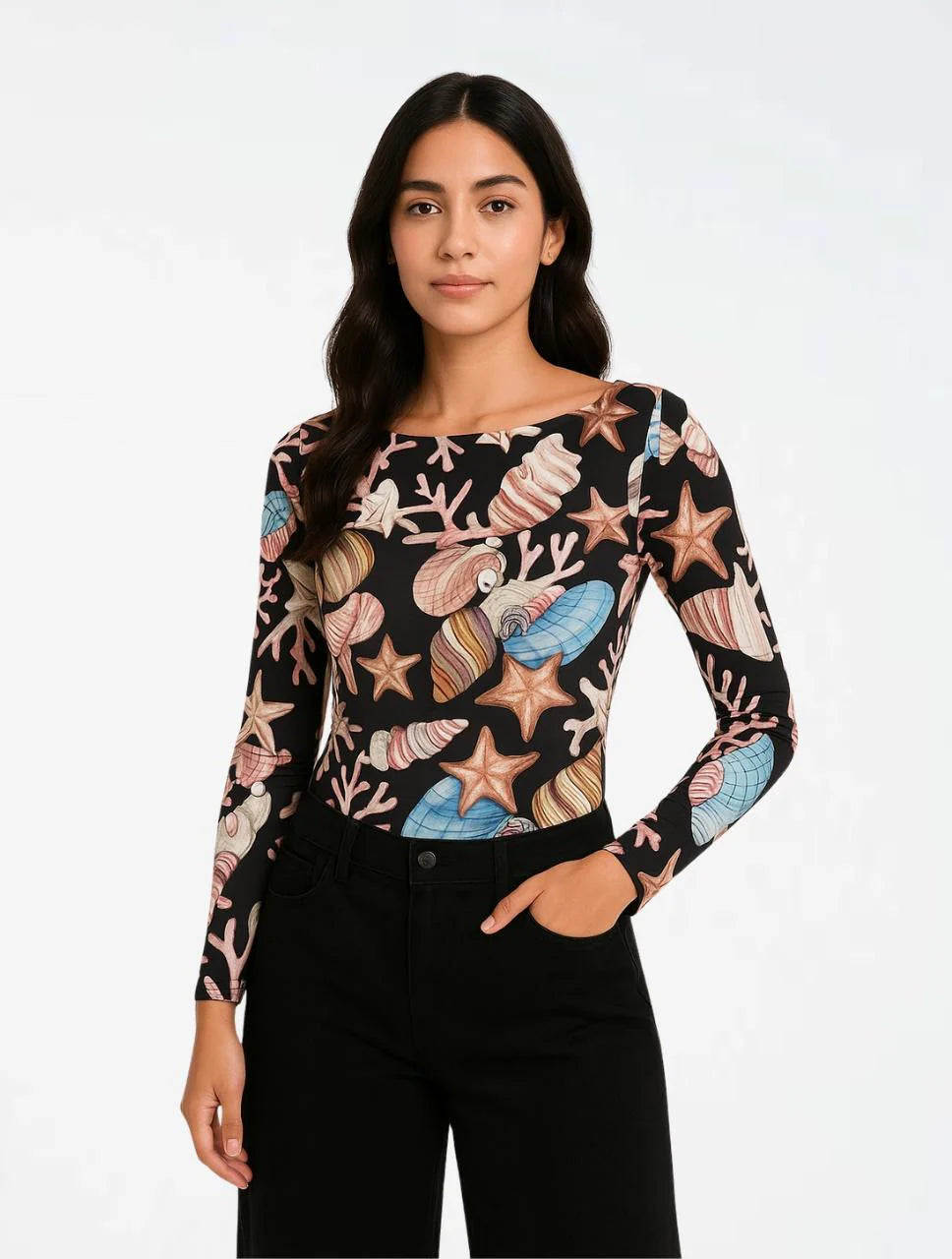 Vestido con estampado marino de corales, estrellas de mar y caracolas, confeccionado en tela suave y fresca que no se arruga, ideal para todo clima. Presenta espalda descubierta con corte cuadrado y diseño femenino. Elaborado en poliéster y spandex, cubre de la talla S a la XL en talla única. Hecho responsablemente por mujeres colombianas.