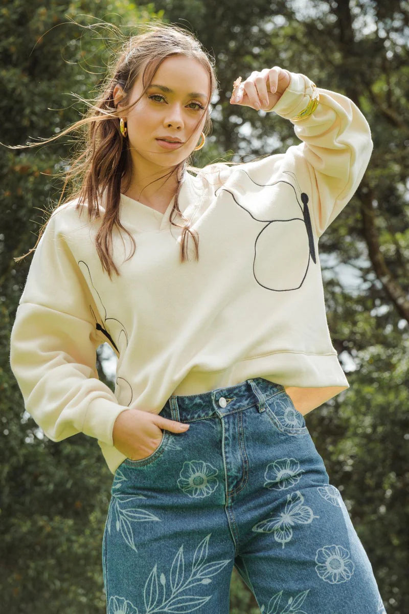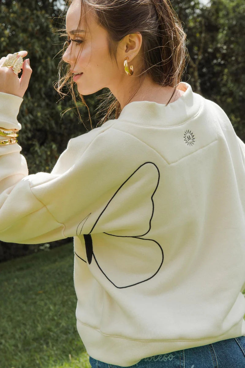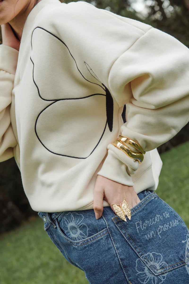 El buzo Mariposa tiene un diseño versátil y lleno de significado. Confeccionado en algodón suave y fresco, este buzo beige se destaca por su bordado de mariposa en contraste. De silueta relajada y cuello V, es perfecto para acompañarte en tus días casuales con un toque único y especial.