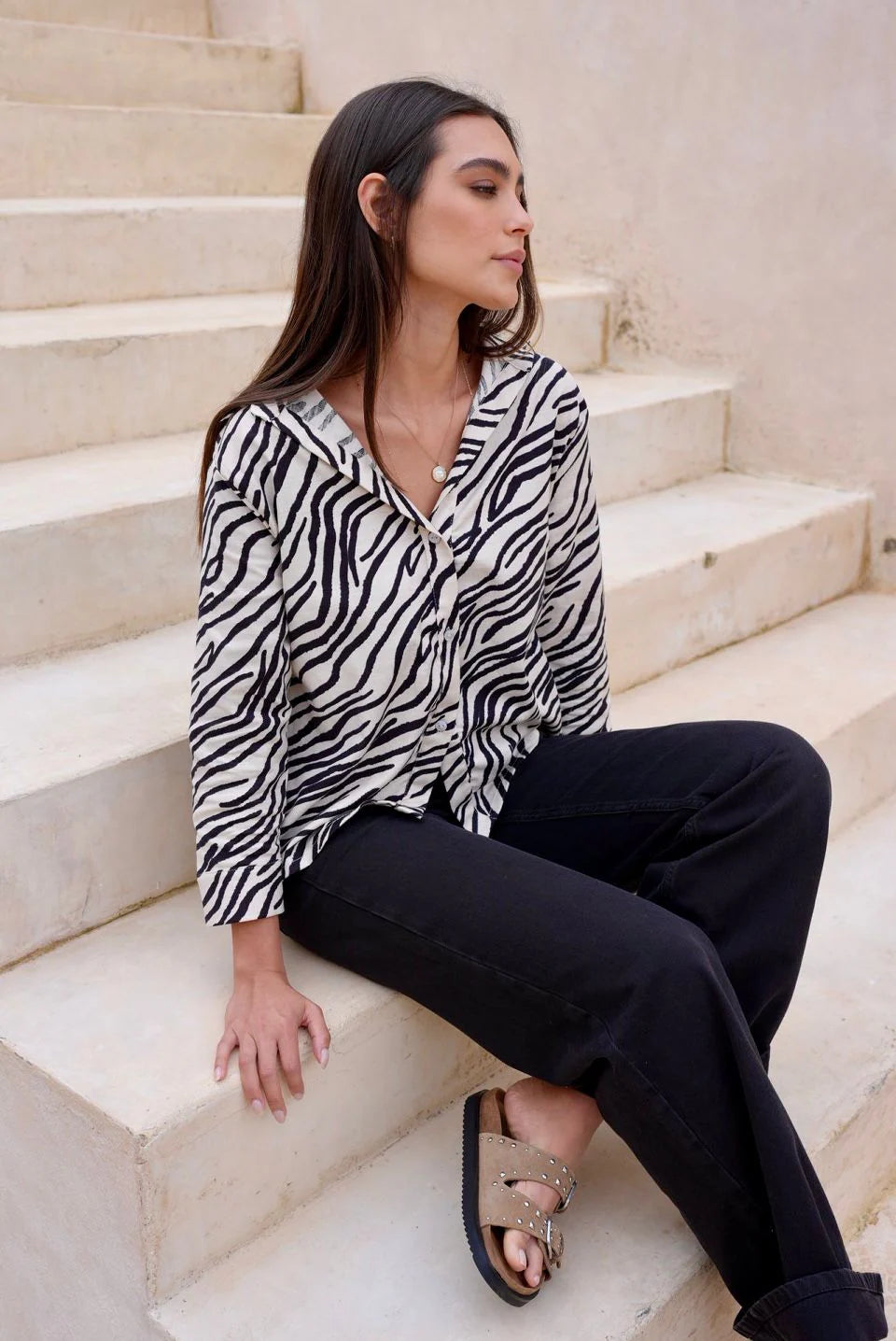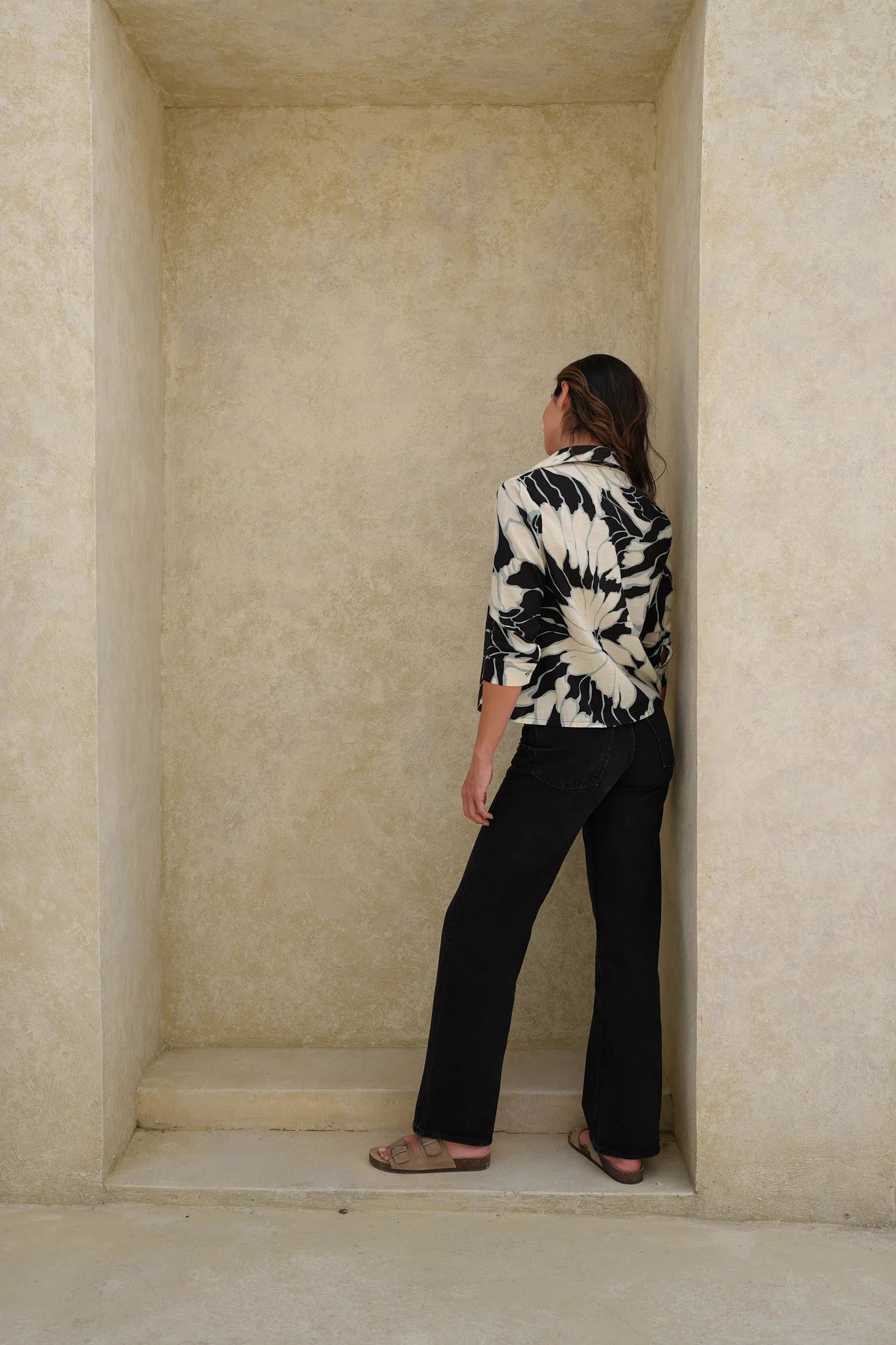 La Camisa Suecia está confeccionada en tela de rayón, una fibra suave y ligera que aporta frescura y movimiento, con diseño de manga midi, botones al frente y un llamativo estampado en contraste.