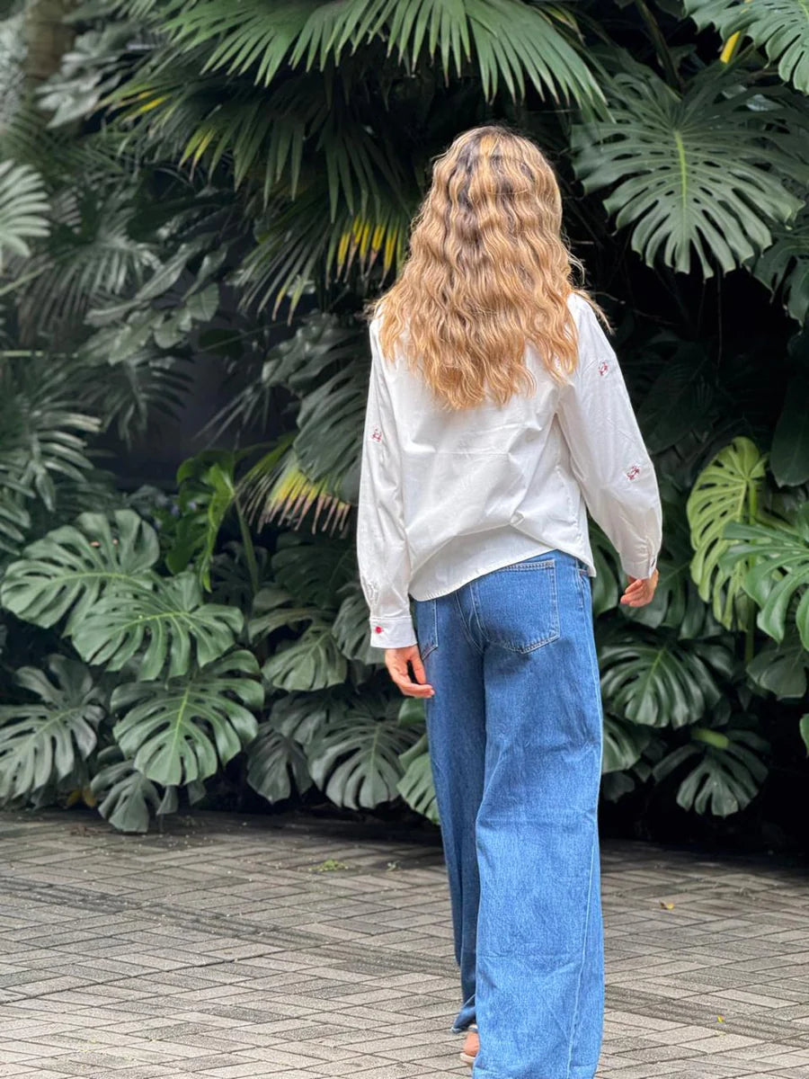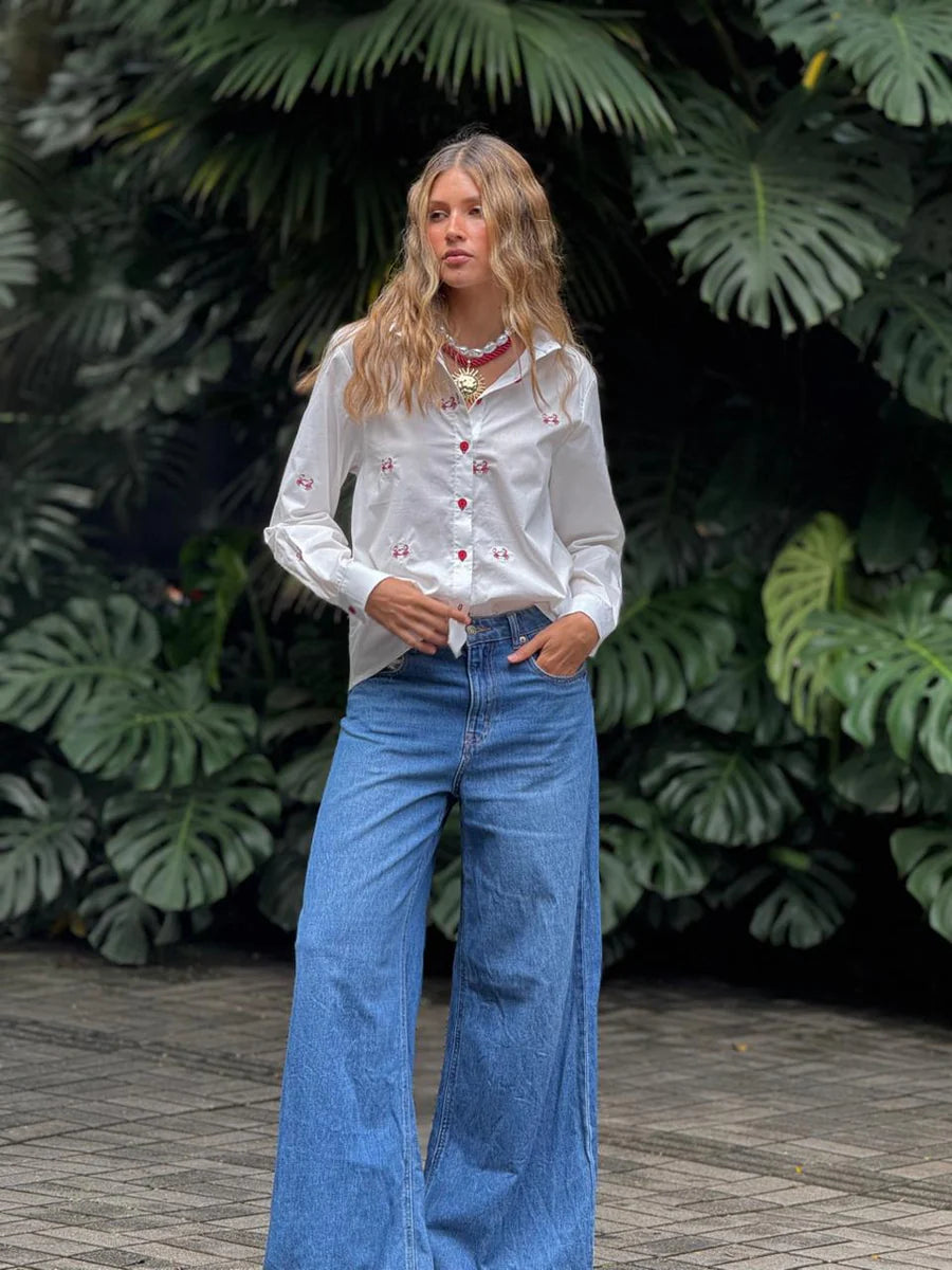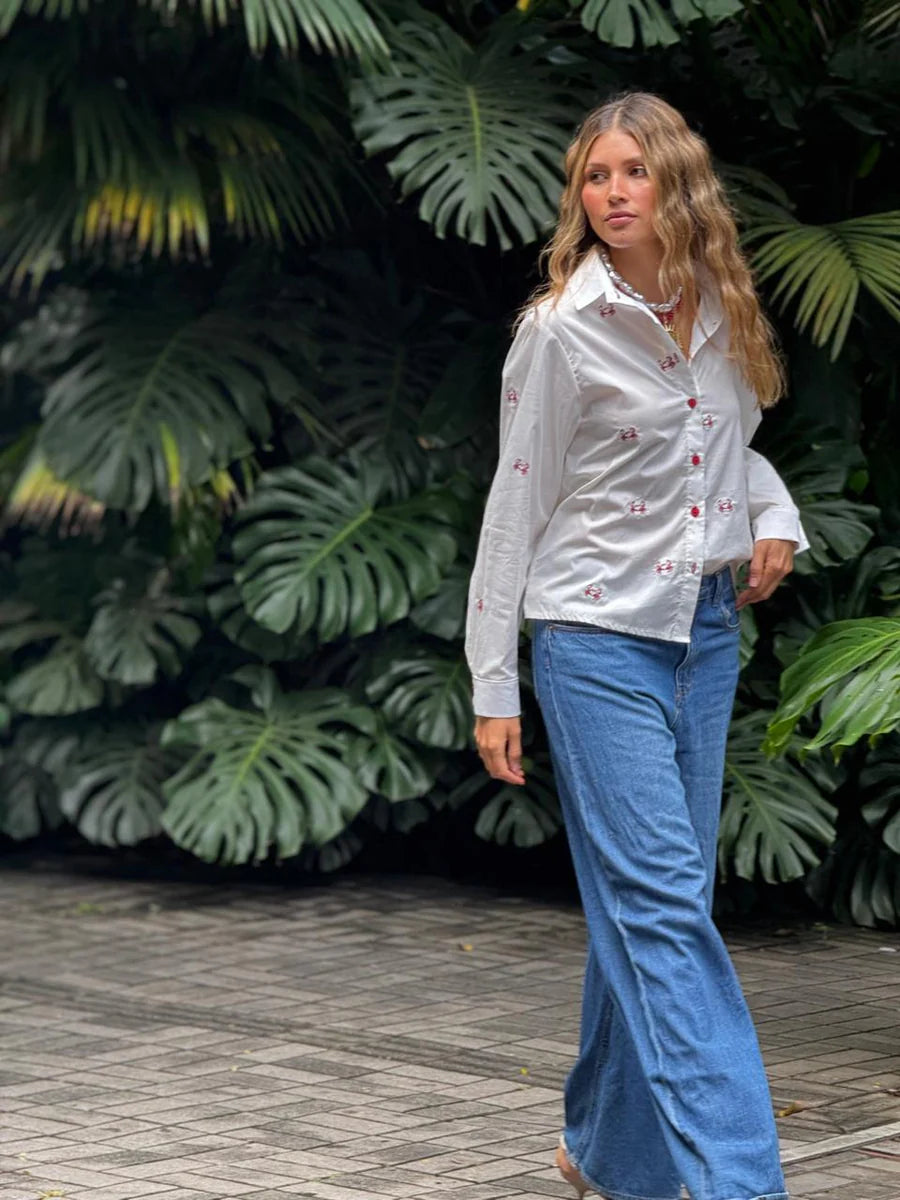 La camisera Cangrejo es una prenda clásica con un toque divertido y sofisticado. Su diseño en tela ligera, con bordados de pequeños cangrejos y botones rojos, la convierte en una pieza única y llena de personalidad. Perfecta para combinar con jeans o faldas y lograr un look fresco y diferente.