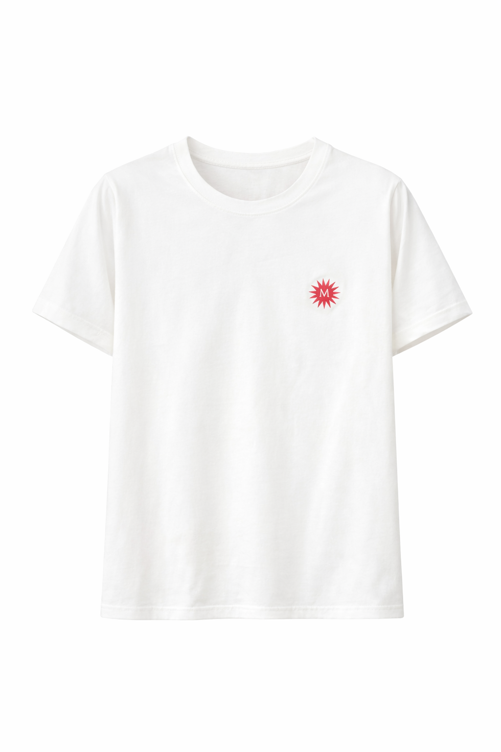 Camiseta Alma de silueta recta y manga corta, confeccionada en tejido suave de acabado liso, con cuello redondo clásico y pequeño gráfico frontal en el pecho que incorpora un símbolo solar con la letra “M” en el centro; su estructura ligera y caída natural aportan una apariencia limpia y equilibrada, con terminaciones discretas que mantienen una línea uniforme en toda la prenda.