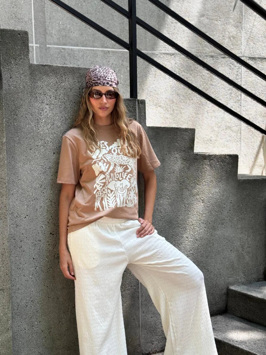 La camiseta Selva es perfecta para los días llenos de buena vibra. Su diseño con estampado transmite esa sensación veraniega que nunca pasa de moda. Confeccionada en una tela suave, fresca y de excelente calidad, es ideal para acompañarte en looks relajados, playeros o urbanos con un toque divertido.