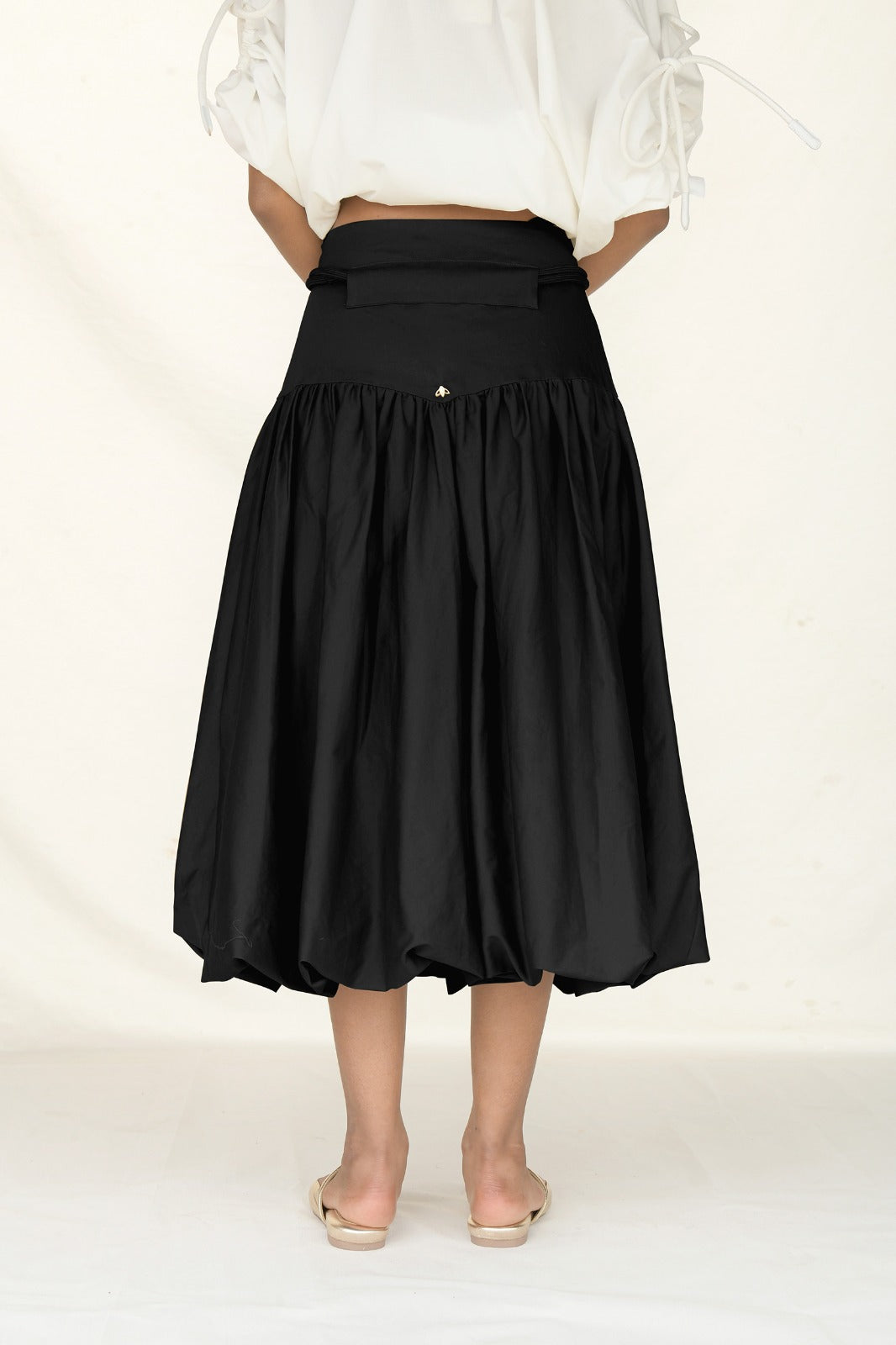 La Falda Benjoi presenta una silueta suave y envolvente con un movimiento natural que combina romanticismo y estructura; su pretina ancha realza la cintura, mientras que el volumen recogido en la parte inferior crea una forma orgánica y femenina, confeccionada en algodón liviano que aporta frescura y fluidez.