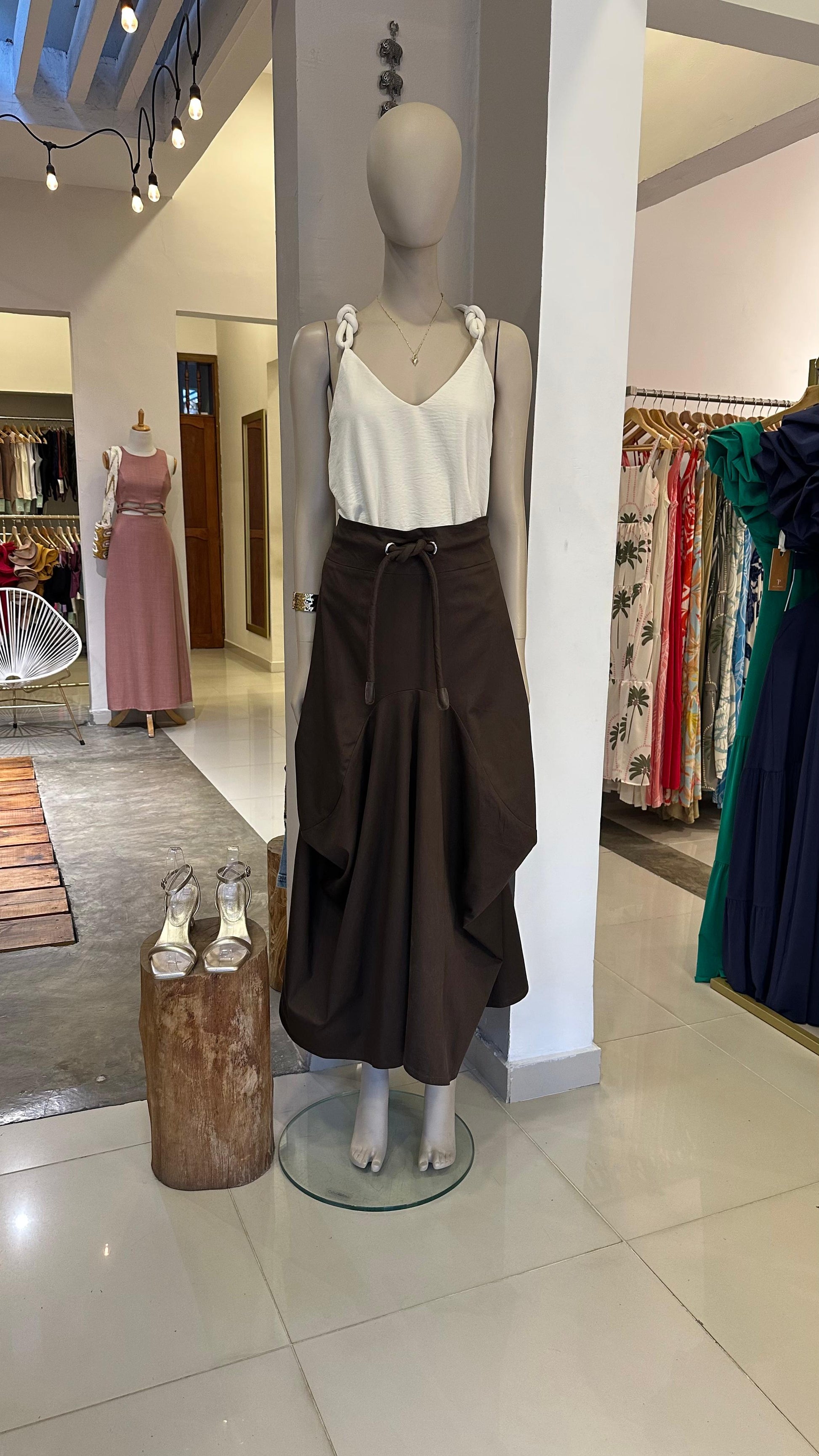 Falda Cote se define por su diseño de silueta amplia con caída asimétrica y detalles drapeados que aportan movimiento, acompañada de un tiro alto ajustado con cordón que refuerza su carácter estructurado y versátil.