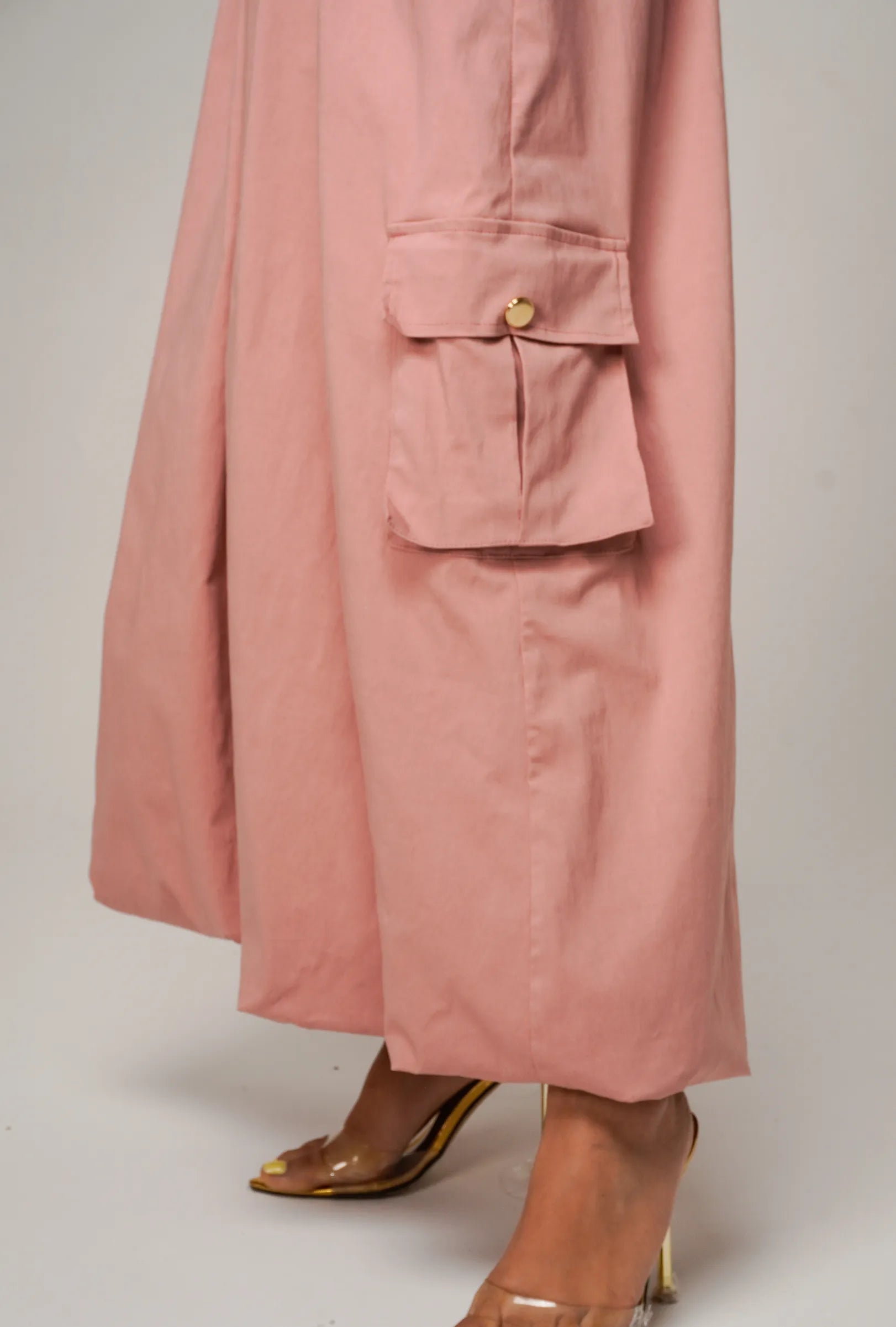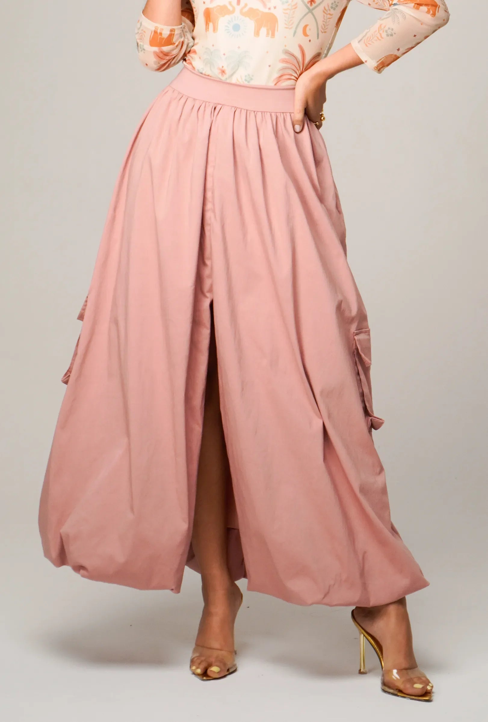 La falda midi de silueta globo está confeccionada en un tejido de alta calidad con cuerpo, que conserva la estructura sin perder fluidez. Su diseño incorpora una abertura frontal que aporta modernidad, junto con bolsillos cargo laterales funcionales que equilibran el estilo utilitario con un aire femenino.