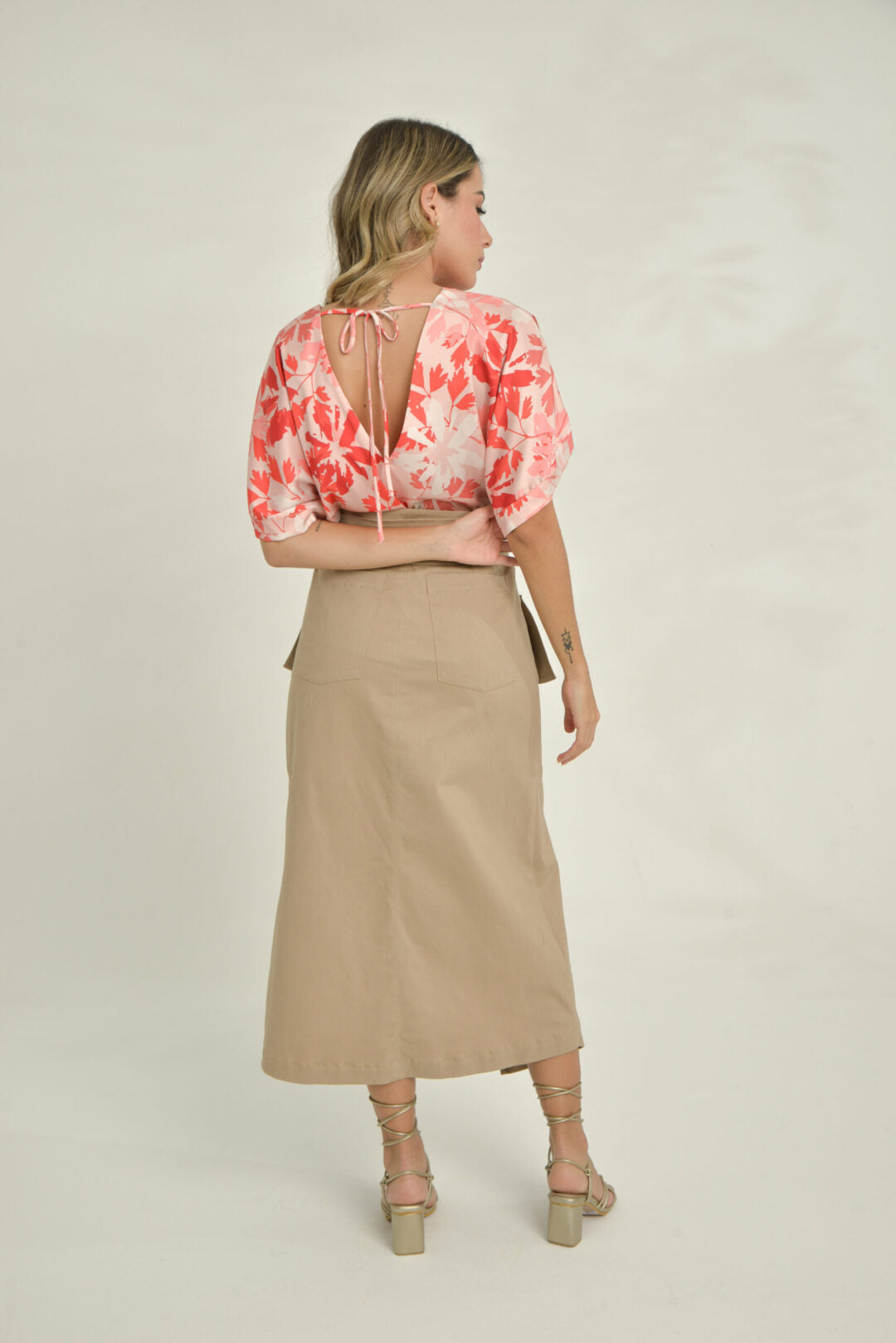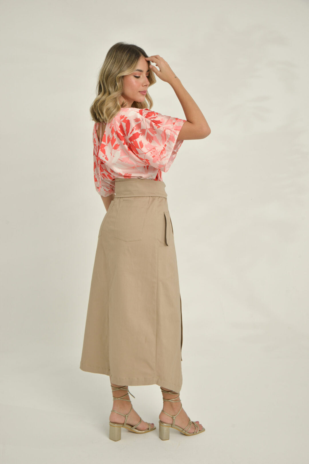 La Falda Gretta presenta un diseño cruzado con un lazo ancho que se anuda en la cintura, creando una silueta envolvente y femenina. Confeccionada en un tono caqui y de caída estructurada, incluye bolsillos laterales y una abertura frontal que aporta movimiento y ligereza al caminar. Su confección resalta líneas limpias y un acabado pulido que realza la forma natural del cuerpo.