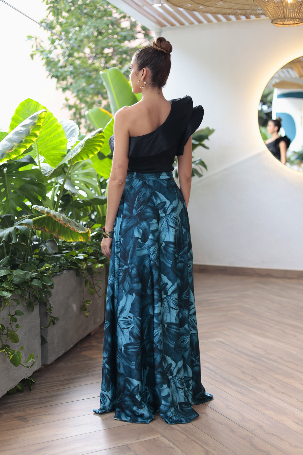Falda Lucía se presenta con un diseño de talle alto y caída amplia que aporta movimiento elegante a la silueta. Su estampado en tonos azul profundo con motivos florales crea un efecto visual envolvente, mientras que el contraste con el top negro de un solo hombro resalta la armonía entre sobriedad y frescura en la prenda.
