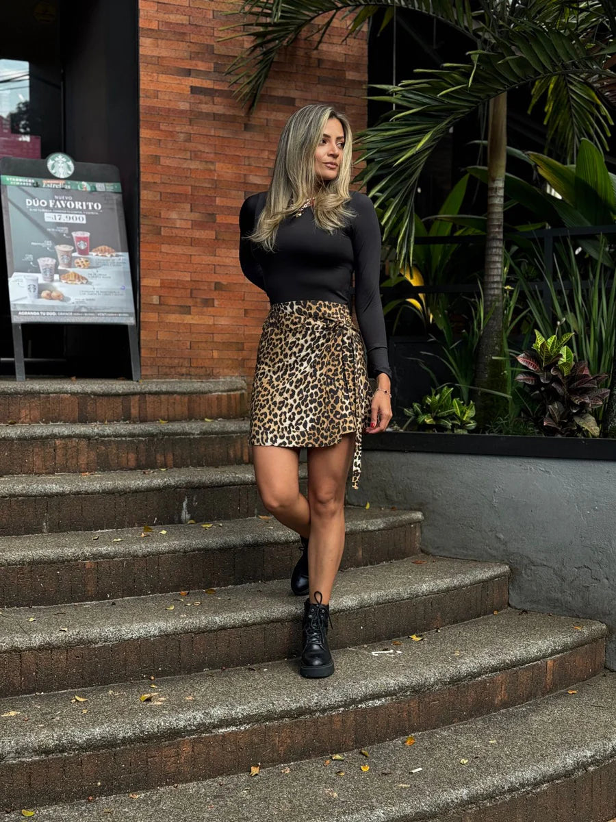 La falda Wild tiene uu estampado animal print el cual es el protagonista ideal para elevar cualquier look, mientras que su lazo lateral le da ese detalle femenino y sofisticado que enamora. Con un fit cómodo y moderno, es perfecta para combinar con tops básicos, blusas o chaquetas denim, creando outfits versátiles para el día o la noche.