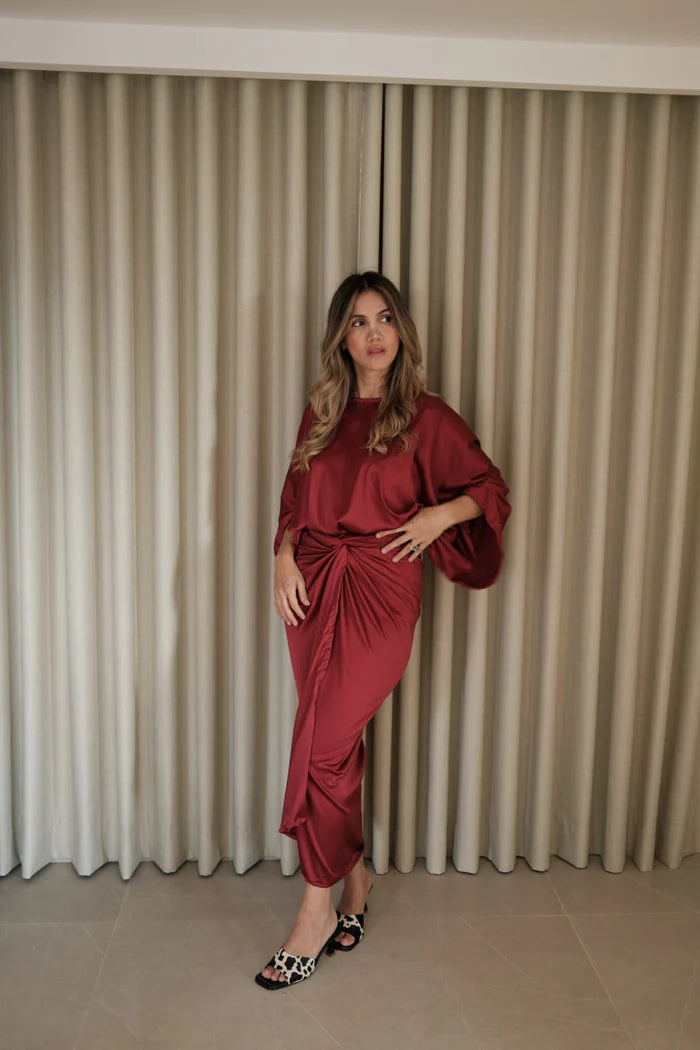 El set Amapola está confeccionado en satín con un acabado fluido que resalta sus pliegues y drapeados, compuesto por una falda de corte midi y una blusa versátil que puede ajustarse y transformarse en diferentes siluetas, permitiendo que una misma prenda se lleve de varias maneras sin perder su elegancia natural.