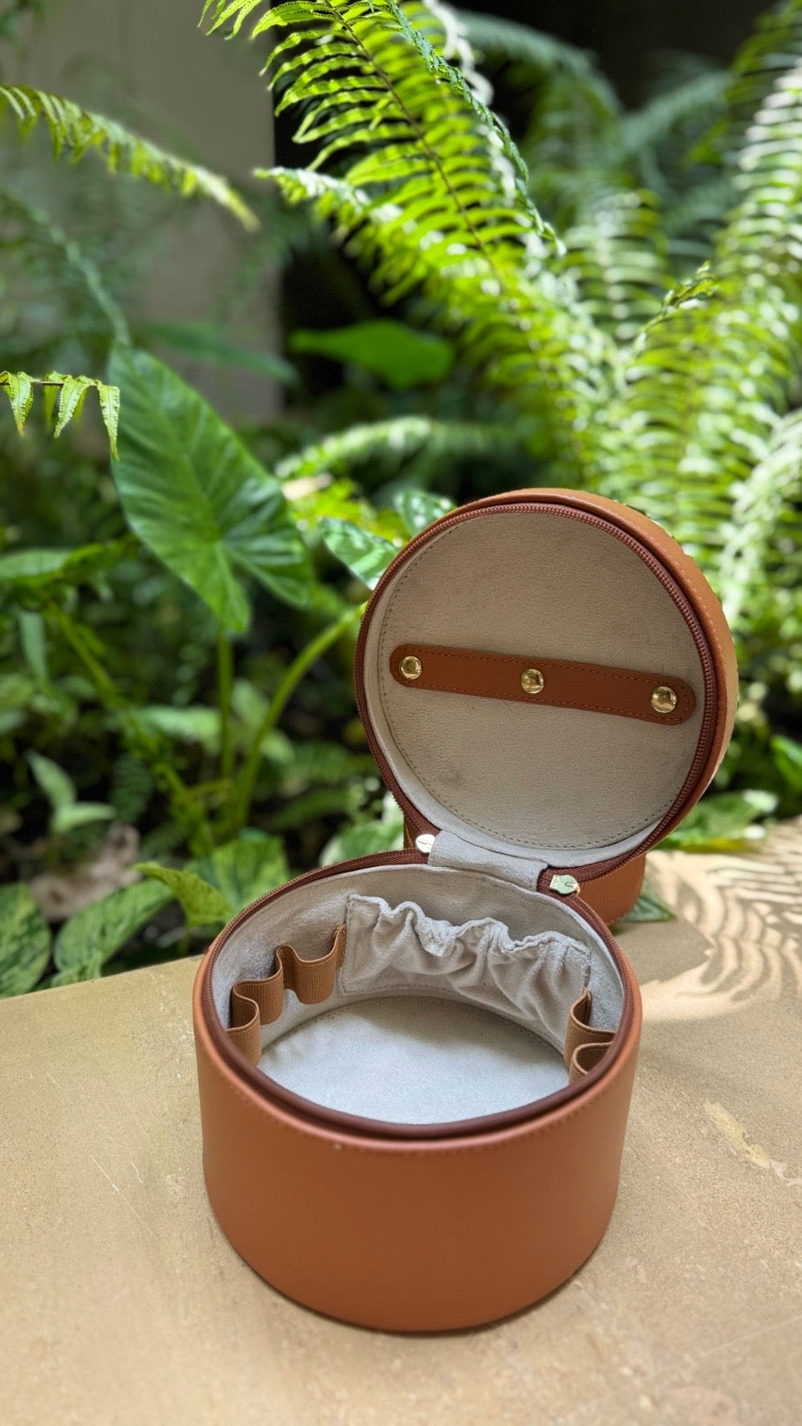 Skincare bag con diseño redondo y cierre de doble cremallera en acabado dorado, confeccionado en material de textura suave tipo cuero, un material resistente que no se pela ni se descascara. Su interior cuenta con forro aterciopelado gris claro, compartimentos elásticos alrededor y una banda con broches metálicos en la tapa, ideales para mantener los productos organizados. Su amplitud permite guardar diferentes frascos, tubos y accesorios de cuidado personal en un solo lugar.