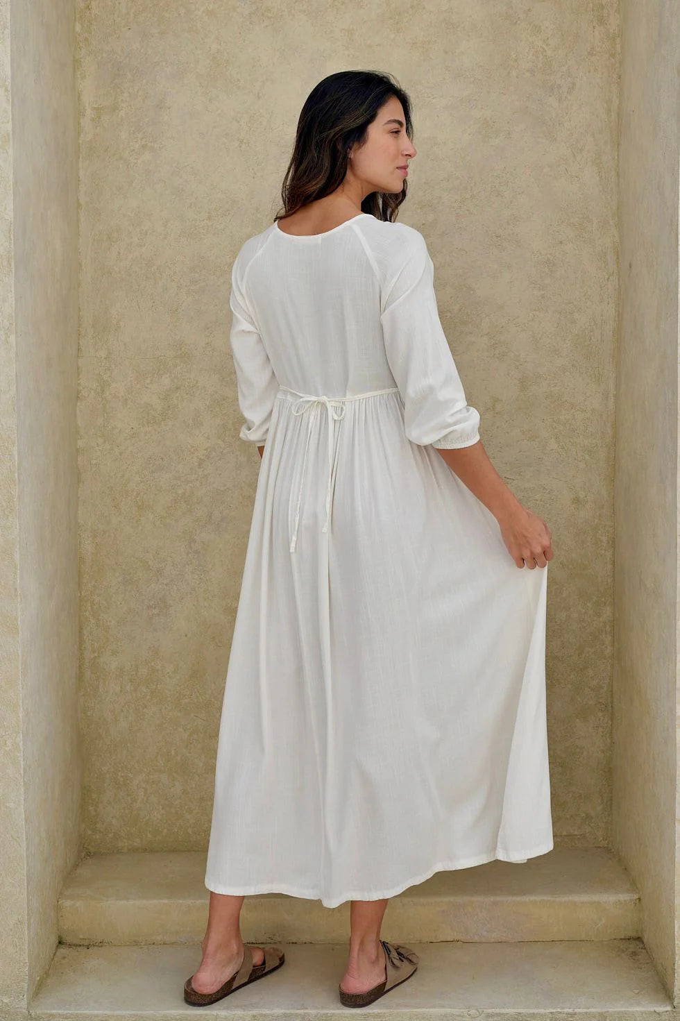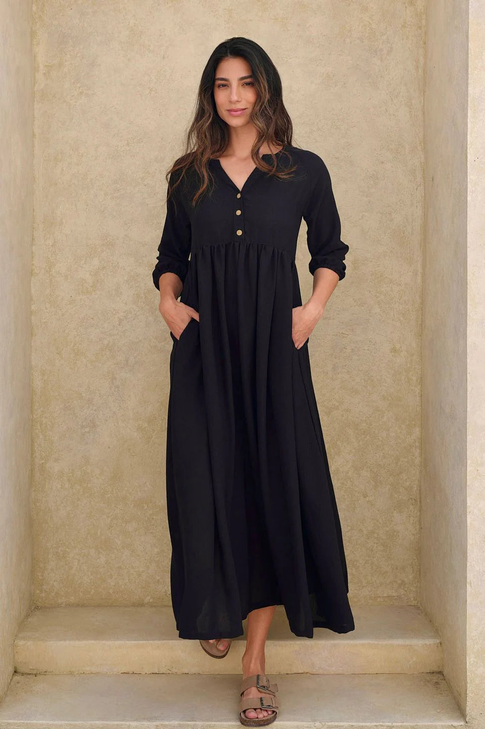 Vestido largo en tela rayón con elongación, escote en V con botones funcionales, mangas con resorte, bolsillos laterales y ajuste en la cintura que aporta comodidad y definición a la silueta.